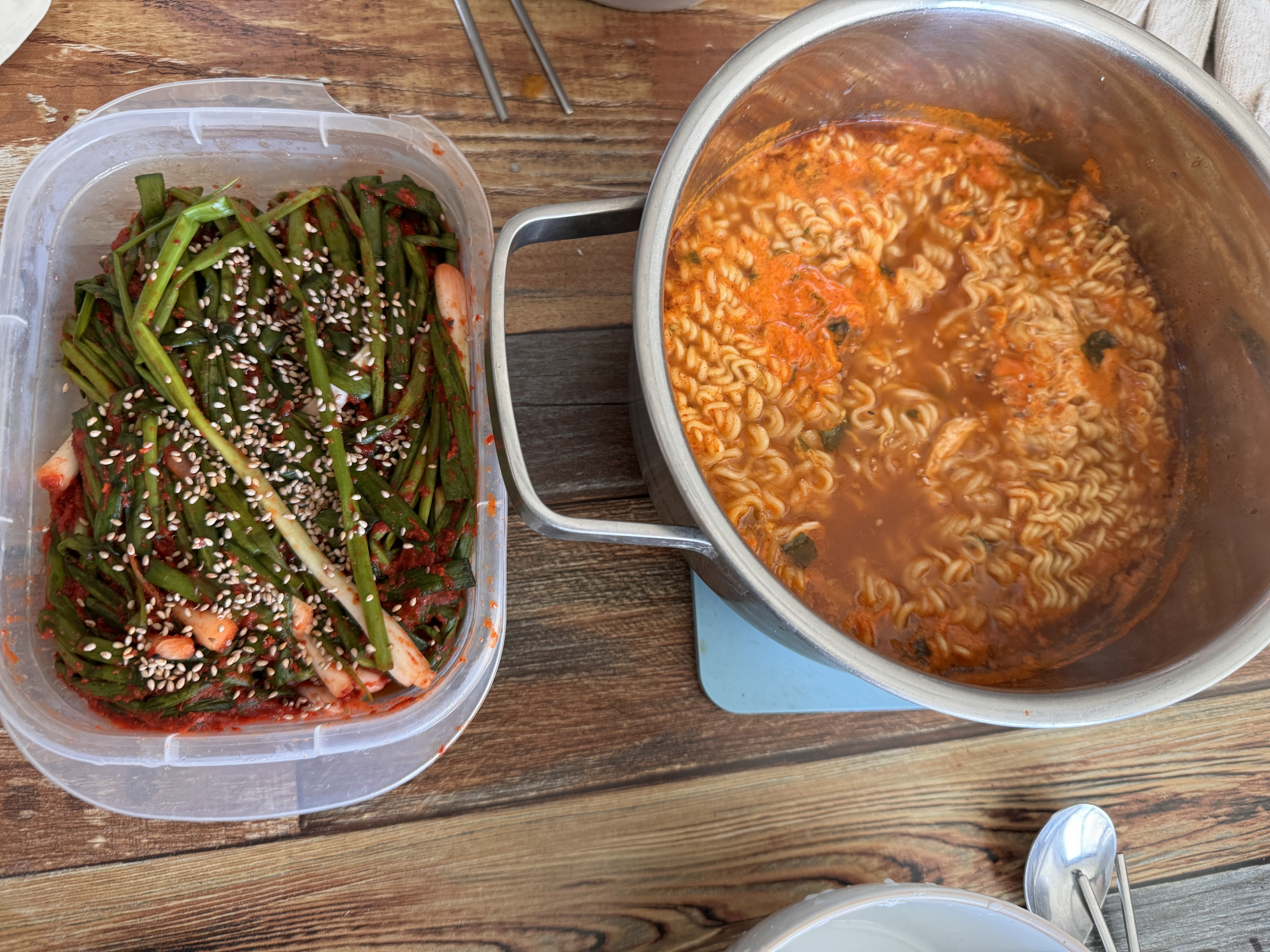 무엇을 먹을까 두리번거리던 스테프니쿠스들은 문득 어제 담근 파김치가 생각났고, 두 손은 자연스레 라면으로 향했다.